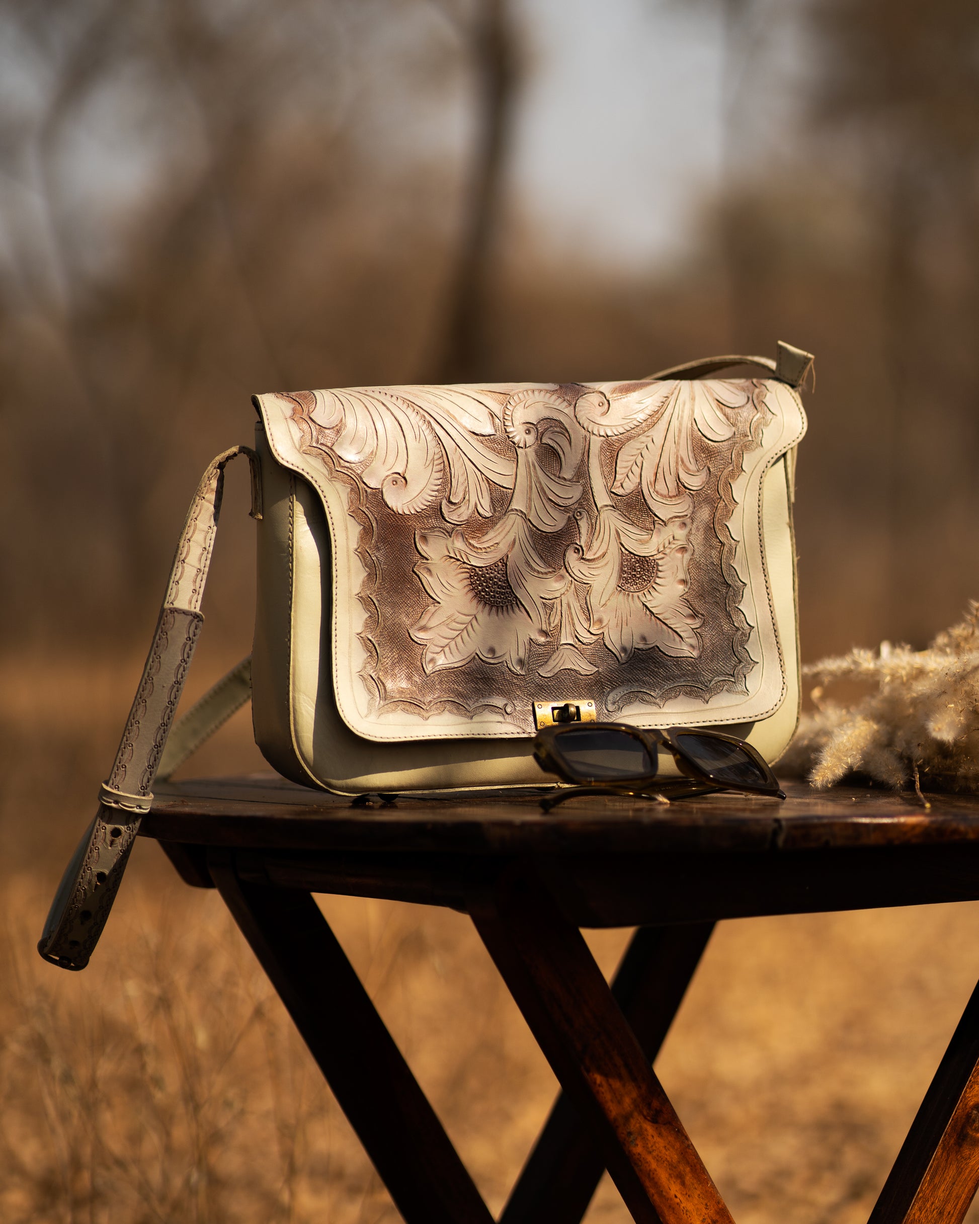 The exquisite and impressive Grey Tooled Women Bag at Royal Stache are entirely cut, stitched, and decorated with the help of hands. And this is the reason why each and every product of ours stand out from crowd.