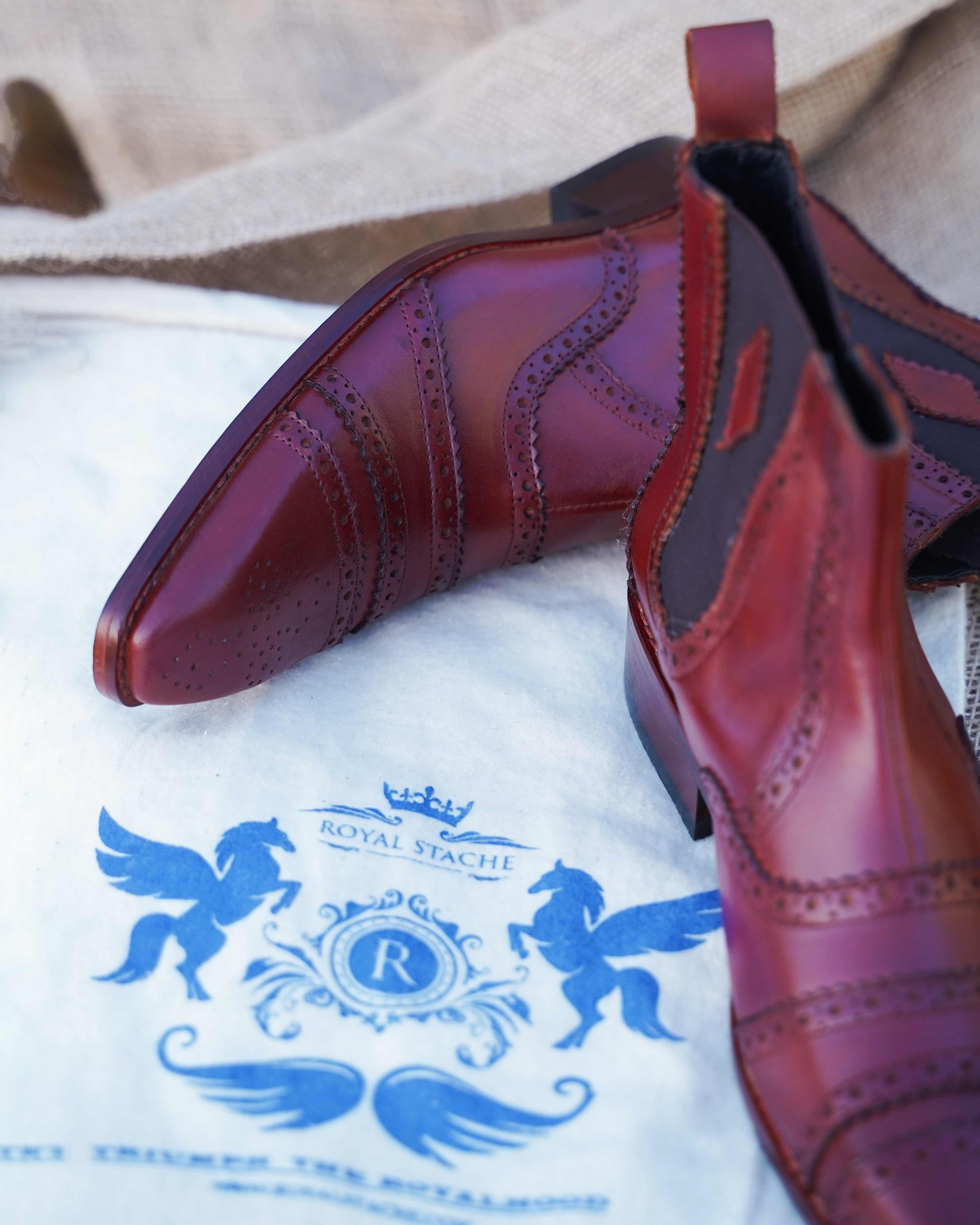 - Royal Stache’s collection of red royal leather boots is completely decorated by hands. The handcrafted art in the boots including staining, painting, designing, and styling is all set to give a vintage glance