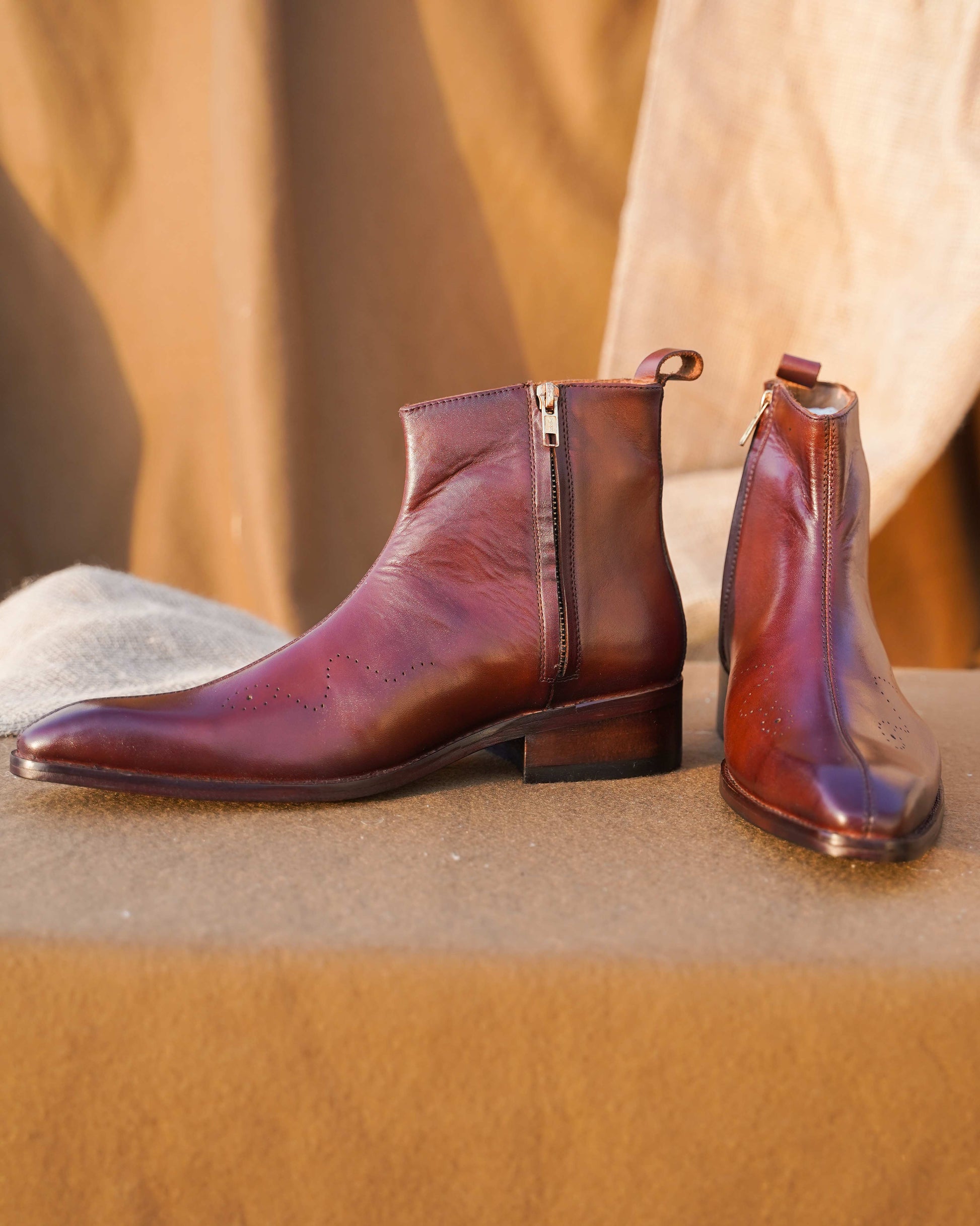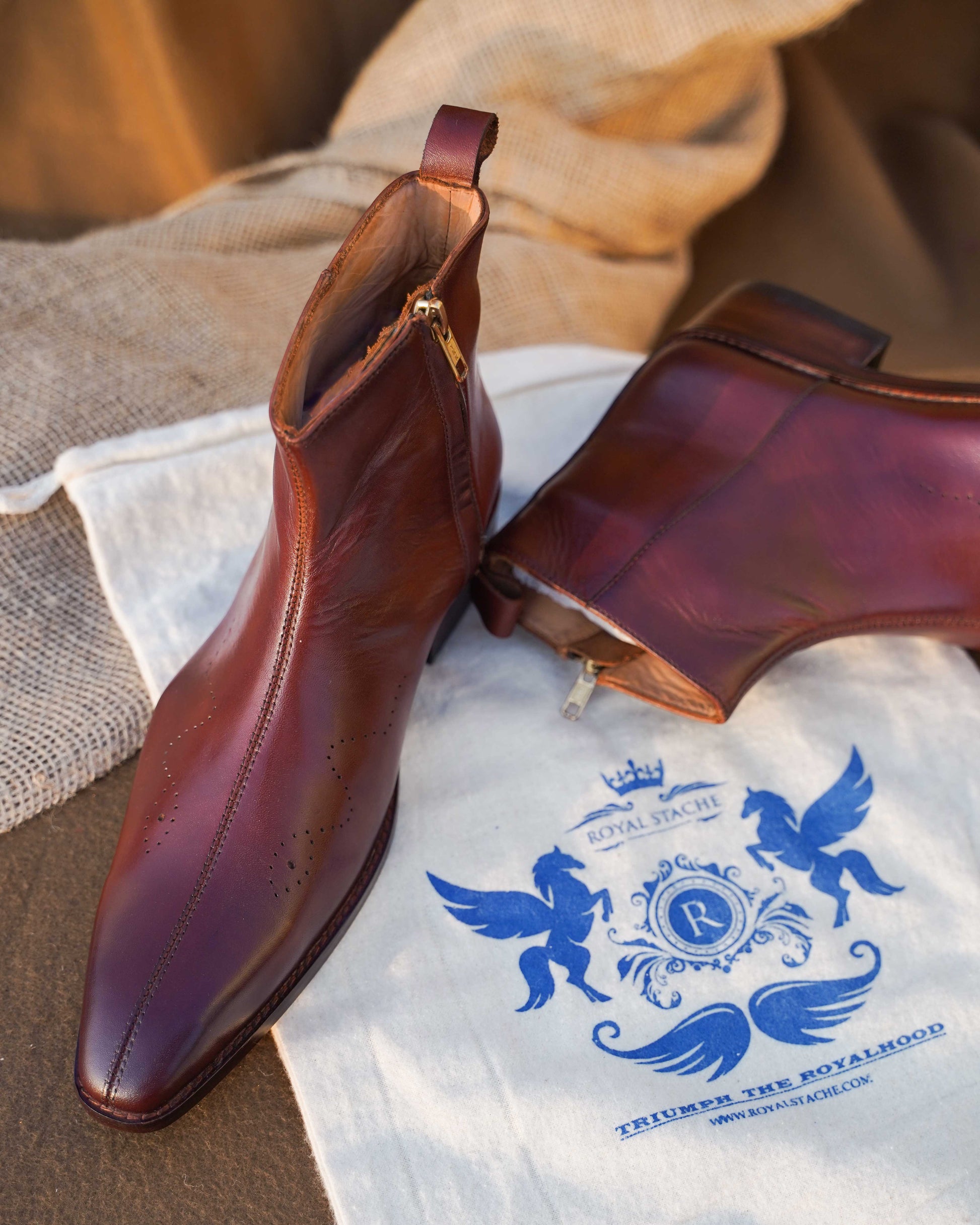 - Royal Stache’s collection of red royal leather boots is completely decorated by hands. The handcrafted art in the boots including staining, painting, designing, and styling is all set to give a vintage glance